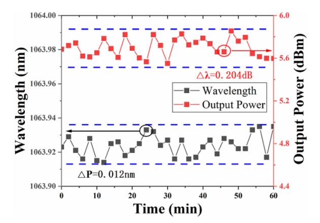图 5.输出功率和波长在60分钟内的稳定性,间隔为2分钟。