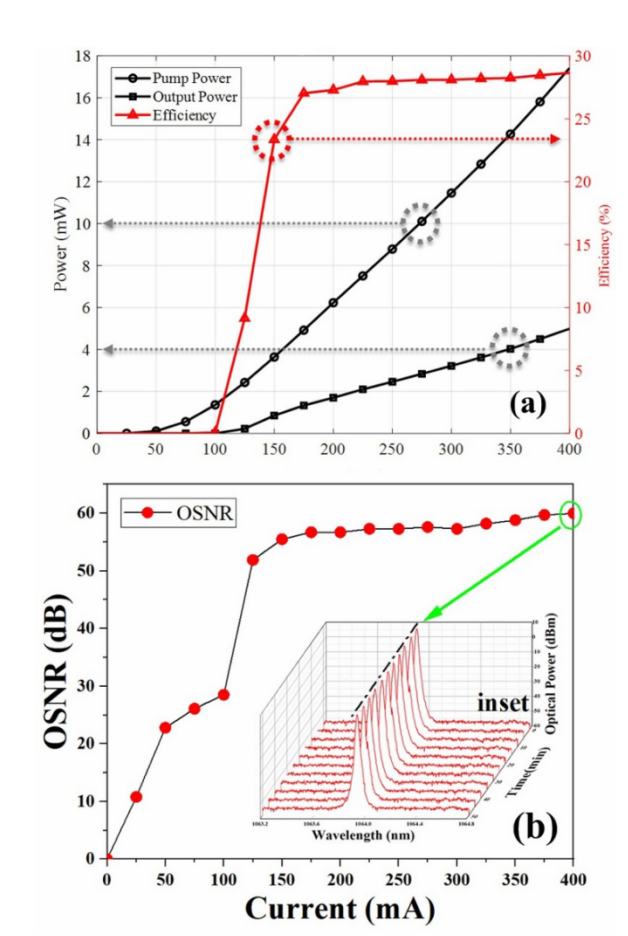 如图4所示,激光输出与驱动电流的关系图:(a)说明泵浦功率、输出功率和转换效率,以及(b)显示输出光信噪比OSNR。在图4a中,当驱动电流范围为200--400mA时,功率转换效率基本保持在28.6%。同时,图 4b显示,当驱动电流达到 400 mA 时,输出OSNR 稳定在60dB。在图4b中,输出光谱的稳定性测试在一小时内以5分钟的间隔进行。据观察,光谱的变化很小,波长保持在1064nm左右,OSN 保持在大约 60 dB。