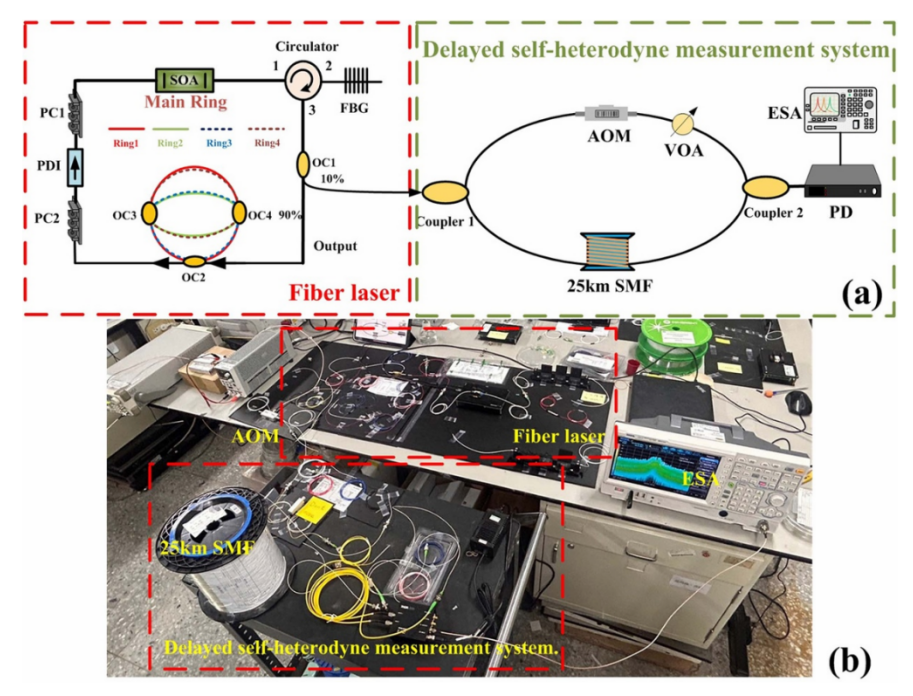 图 3.(a)延迟自外差测量系统 (b)实验设置环境:VOA可变光衰减器;AOM声光调制器;PD光电探测器;ESA频谱分析仪;SMF单模光纤