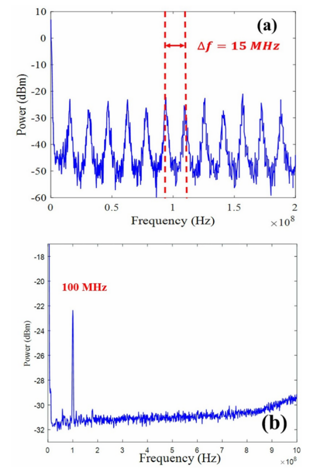 在图6a中,在没有四个子环谐振器的延迟自外差测试装置DSHMS测量中,0--200MHz 范围内平均峰值之间的频率间隔约为15MHz,这对应于中心腔中约13.69米的纵模间距长度。图6b显示了当驱动电流固定为400mA时,在1GHz范围内以1MHz分辨率带宽测得的射频RF拍频。除了来自AOM的固有100MHz移位信号外,观察到无其他拍频频率,表明所建议的激光器在稳定的单纵模中运行。