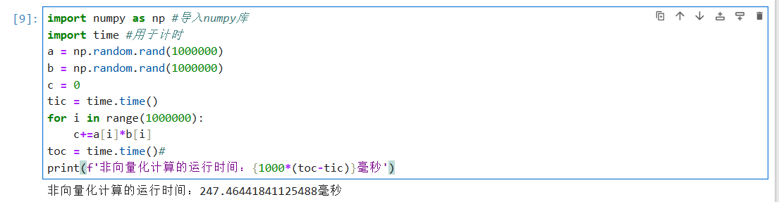 我们再通过非向量化,即使用for循环的方式来一遍这个过程,就能发现二者在效率上的显著差别。