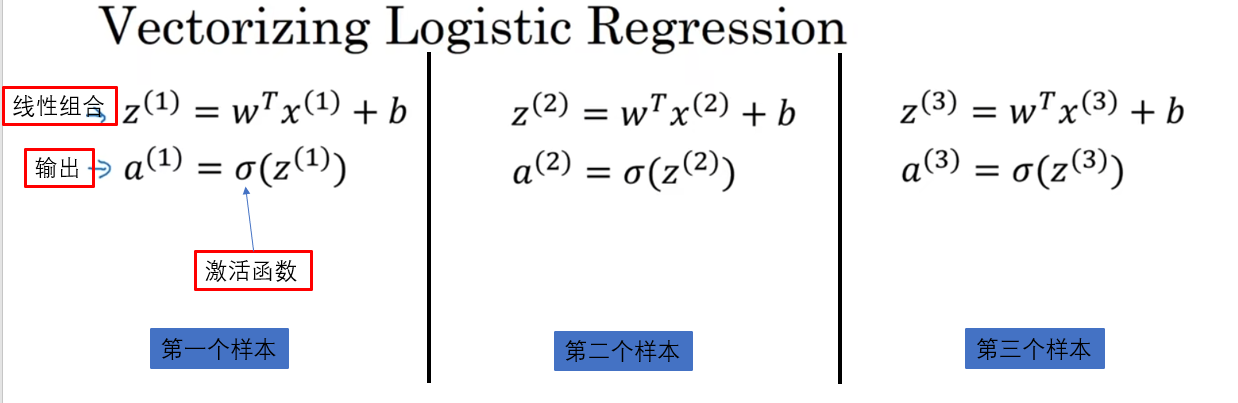先回忆一下,逻辑回归的正向传播是从输入进行线性组合得到加权和,再经过激活函数得到输出的过程,而在一次迭代中,如有 \(m\) 个样本,就要计算 \(m\) 次这样的过程。