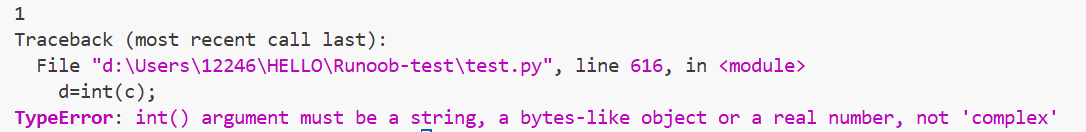 1 是对 a 进行 int 转换的结果,是 b 的值,后面的报错是因为对复数 c 进行了 int 转换,这个错误信息表明尝试将一个复数(complex)类型转换为整数(int)类型,而这是不允许的。int() 函数只能接受字符串、字节对象或实数(如整数和浮点数)作为参数,不能接受复数。
