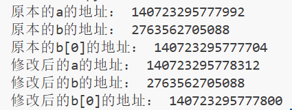 也就是如果修改了某个变量的值,会重新为该变量分配内存空间,但似乎改变列表(下方的变量b)内的元素,列表的内存空间没有改变,感觉b的存在类似于指针。