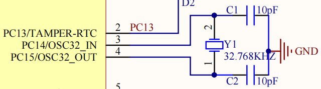STM32单片机PC14(OSC32_IN)和PC15(OSC32_OUT)引脚外接32.768KHZ的晶振,组成外部低速时钟电路。