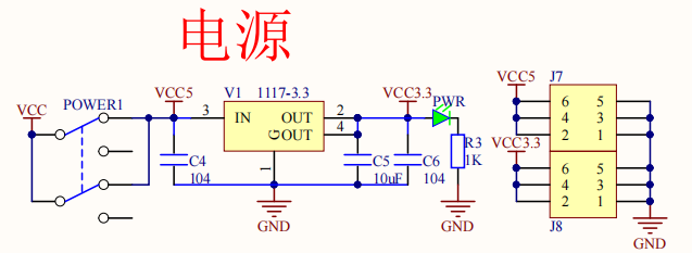 在STM32最小系统板中电源电路为单片机核心、时钟电路、复位电路及必要外设提供稳定、低噪声的电源。