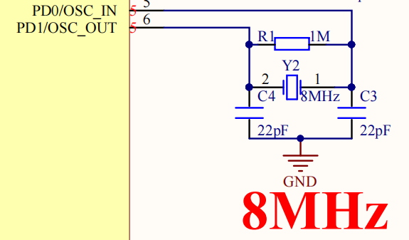 STM32单片机PD0(OSC_IN)和PD1(OSC_OUT)引脚外接8MHZ晶振,并联两个22PF负载电容C3、C4至地,形成LC谐振网络。