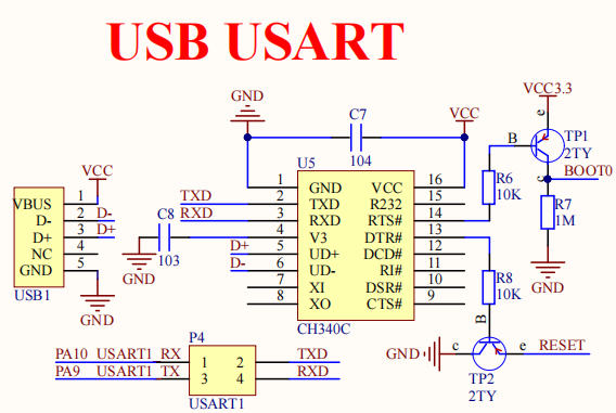 STM的GND与CH340G的GND引脚连接,形成公共地。