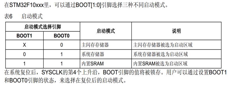 STM32的启动模式由BOOT0和BOOT1引脚在复位时的电平状态决定,共用三种模式: