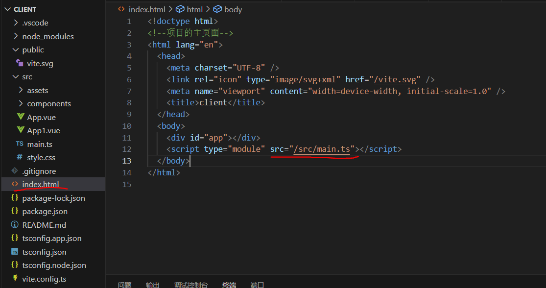 来到这个index.html文件中 ,看到引用了一个Main.ts文件,我们使用Ctrl+鼠标左键点进去