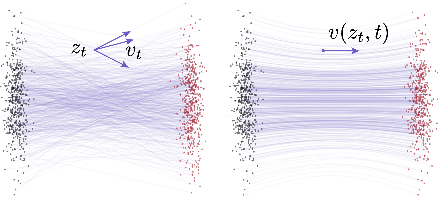 Figure 2: Velocity fields in Flow Matching [28]. Left: conditional flows [28]. A given zt can arise from different (x,ϵ) pairs, resulting in different conditional velocities vt. Right: marginal flows [28], obtained by marginalizing over all possible conditional velocities. The marginal velocity field serves as the underlying ground-truth field for network training. All velocities shown here are essentially instantaneous velocities. Illustration follows [12]. (Gray dots: samples from prior; red dots: samples from data.)