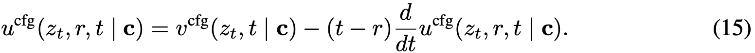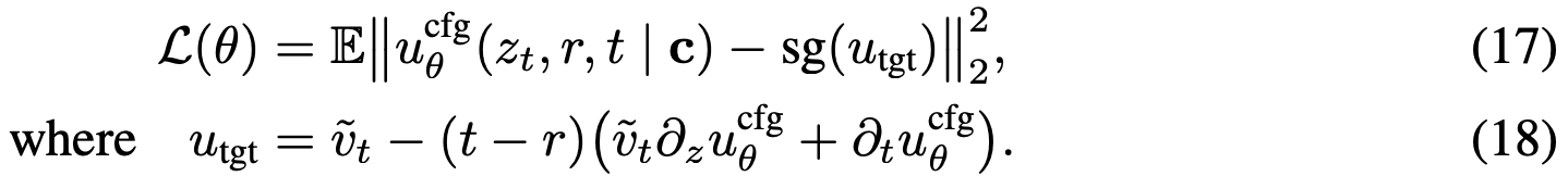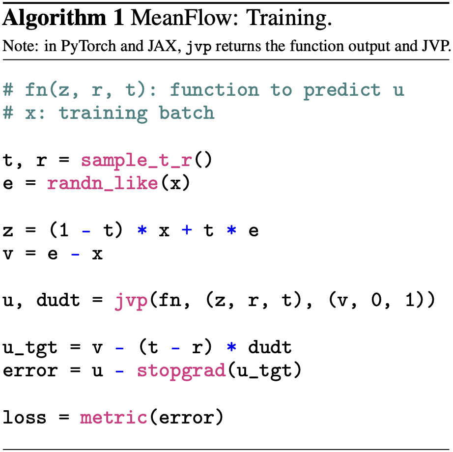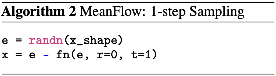 最小化损失函数式(9)的伪代码见算法1。该方法概念简洁:行为类似于流匹配,关键区别在于匹配目标被修正项 调整,该修正源于对平均速度的考量。特别地,若限制 t=r,则第二项消失,方法退化为标准流匹配。