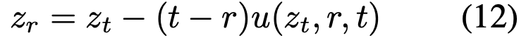 使用 MeanFlow 模型采样时,仅需将时间积分替换为平均速度: