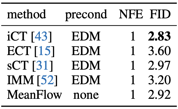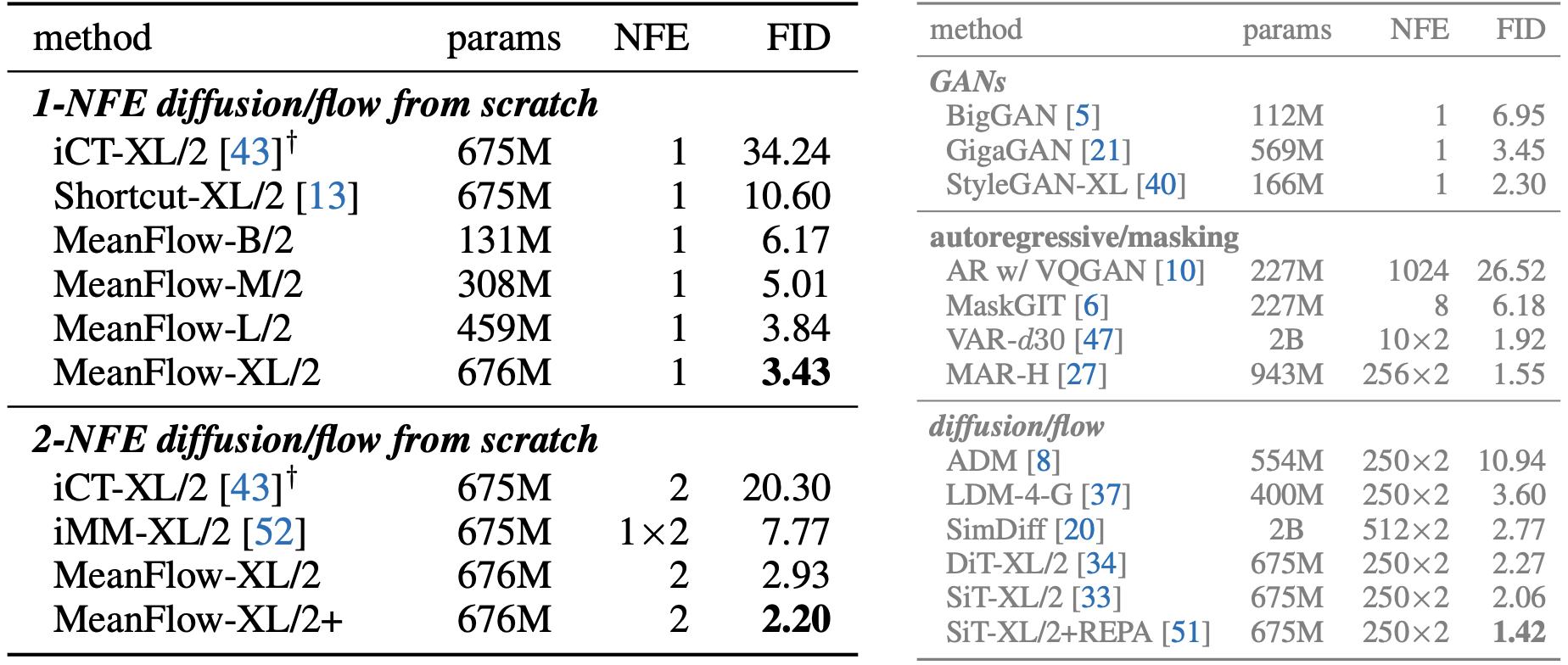 Table 2:Class-conditional generation on ImageNet-256×256. All entries are reported with CFG, when applicable. Left: 1-NFE and 2-NFE diffusion/flow models trained from scratch. Right: Other families of generative models as a reference. In both tables, "×2" indicates that CFG incurs an NFE of 2 per sampling step. Our MeanFlow models are all trained for 240 epochs, except that "MeanFlow-XL+" is trained for more epochs and with configurations selected for longer training, specified in appendix. †: iCT [43] results are reported by [52].