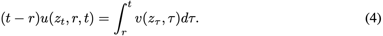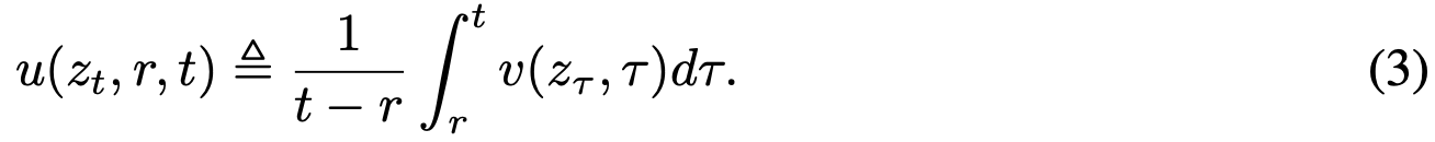 来近似整个流路径。这意味着该方法更适用于单步或少步生成,因为在推理时无需显式近似时间积分------这是建模瞬时速度时的必要步骤。然而,直接使用式(3)定义的平均速度作为网络训练的真实目标不可行,因其需在训练期间计算积分。关键洞见在于,平均速度的定义式可通过变换构建出适用于训练的优化目标,即使仅能获取瞬时速度。