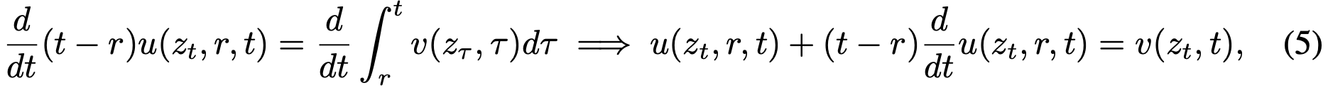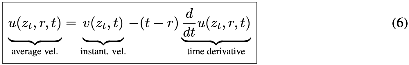 该式称为"MeanFlow 恒等式",描述了 v 与 u 的关系。式(6)与式(4)的等价性易于证明。