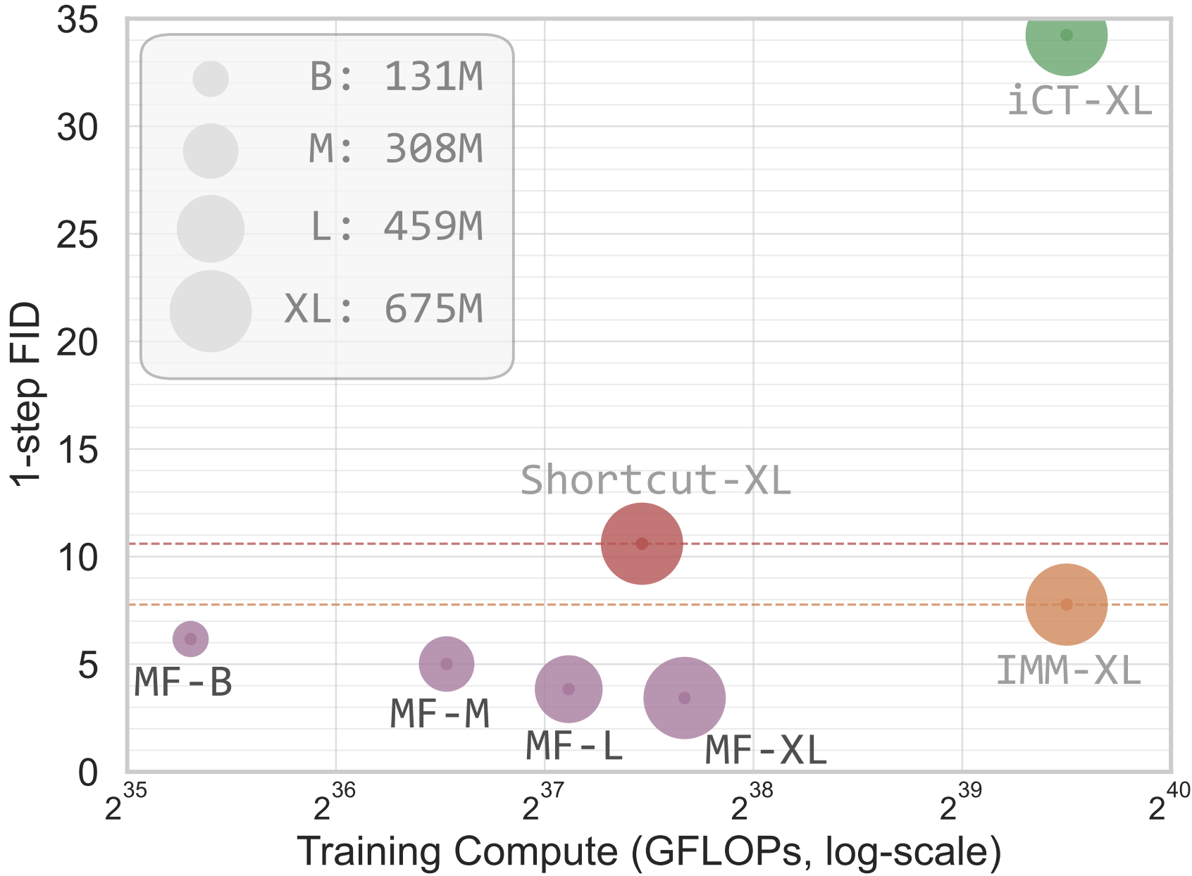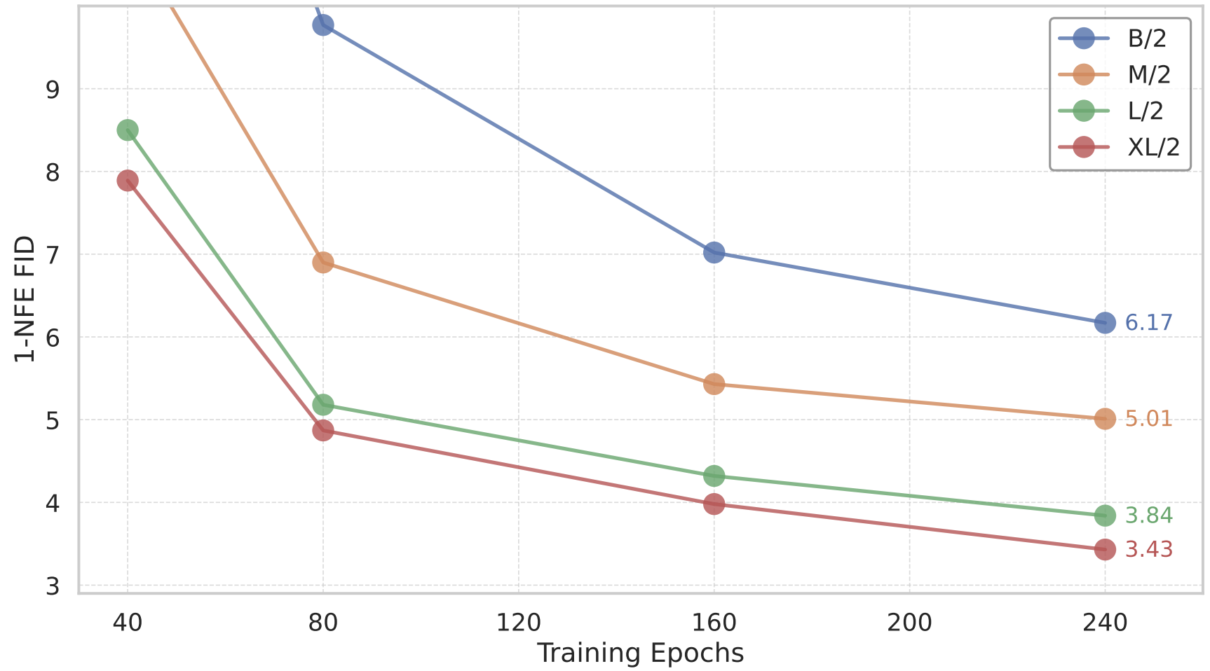 Figure 4:Scalability of MeanFlow models on ImageNet 256×256. 1-NFE generation FID is reported. All models are trained from scratch. CFG is applied while maintaining the 1-NFE sampling behavior. Our method exhibits promising scalability with respect to model size.