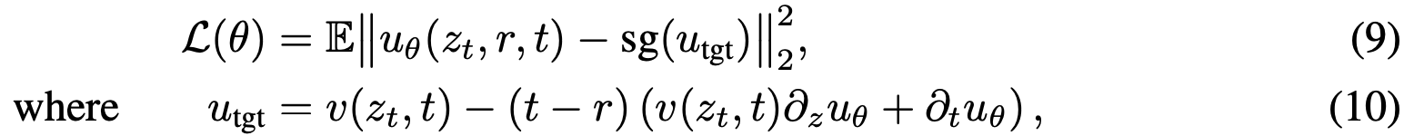 至此,所有公式独立于网络参数化。现引入模型以学习 u。具体地,参数化网络 u_θ 并使其满足 MeanFlow 恒等式。通过最小化以下目标实现: