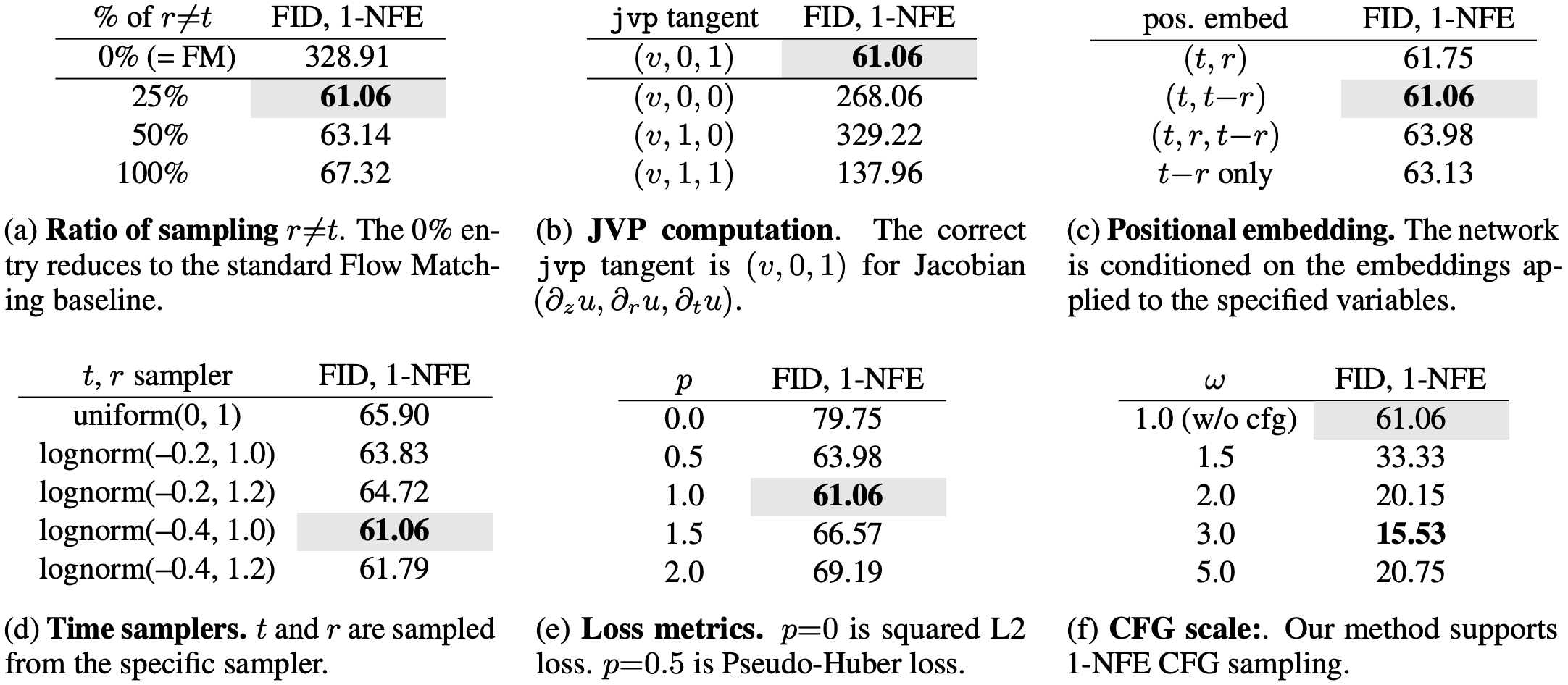 如表1(c)所示,研究不同(r,t)位置编码变体:所有变体均能产生有效的1-NFE结果,证明MeanFlow框架的鲁棒性。其中(t, t−r)编码效果最佳,仅编码间隔t−r也能获得合理结果。