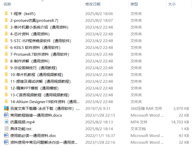 全部资料包括程序(keil5)、protues仿真(protues8.7)、设计说明、答辩PPT、开发资料、资料使用介绍、仿真视频、程序讲解视频、仿真讲解视频、最小系统介绍视频等。