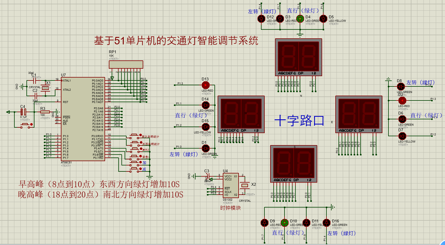 (3)设置自动、手动、特殊情况三种模式。自动模式下,自动显示倒计时,红绿灯自动切换,早高峰(8点到10点)东西方向绿灯增加10S,晚高峰(18点到20点)南北方向绿灯增加10S;