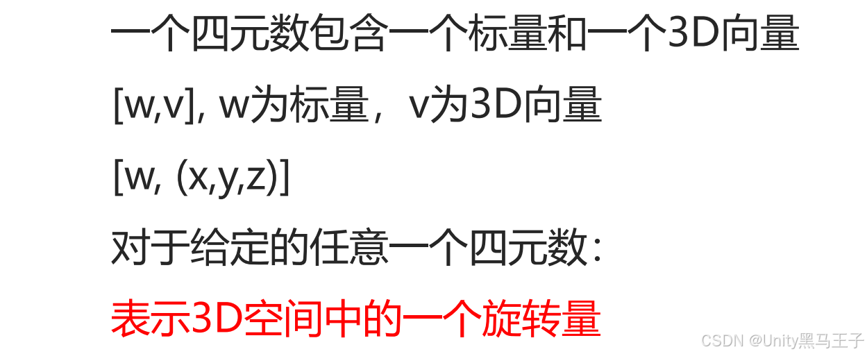 例如:[1,(0,0,0)]和[-1,(0,0,0)]都是单位四元数 表示没有旋转量