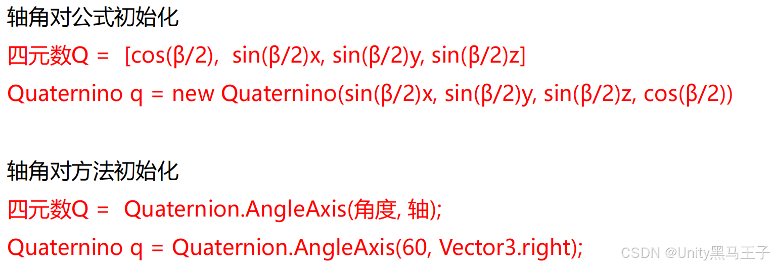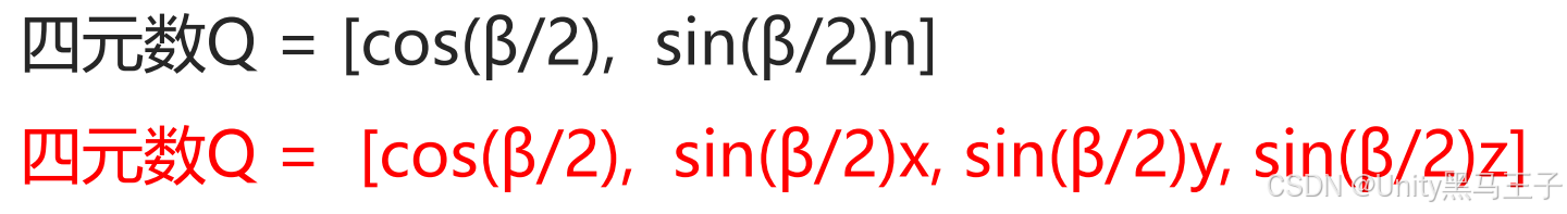 对于给定旋转,假设为绕着n轴,旋转β度,n轴为(x,y,z) ,那么可以构成四元数为: