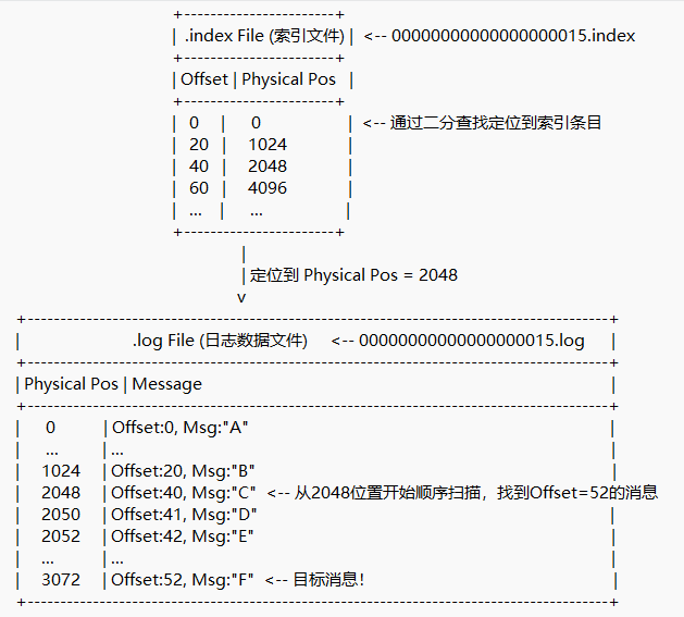 ①确定Segment: 首先根据文件名,确定offset=52的消息位于00000000000000000015.log这个Segment中(因为15 <= 52 < 55:下一个Segment的起始offset)。