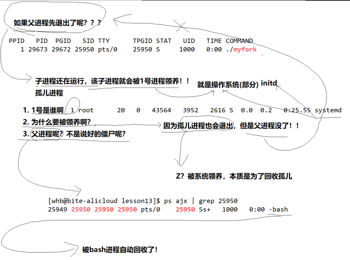 A:==父进程先退出,子进程就被称为"孤儿进程"。==子进程还在运行的话,会被PPID进程领养