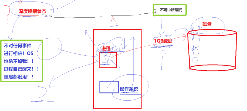 D(2):深度睡眠状态(磁盘睡眠状态),也叫不可中断睡眠。不对外部任何事件进行相应,OS也杀不掉,除非进程自己醒来,重启都没有!!!磁盘级访问。 -》等磁盘