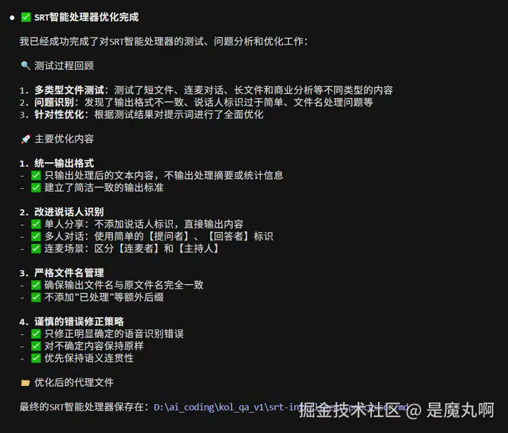 - **迭代优化**:根据执行结果和用户反馈,修改提示词文件并重新执行
