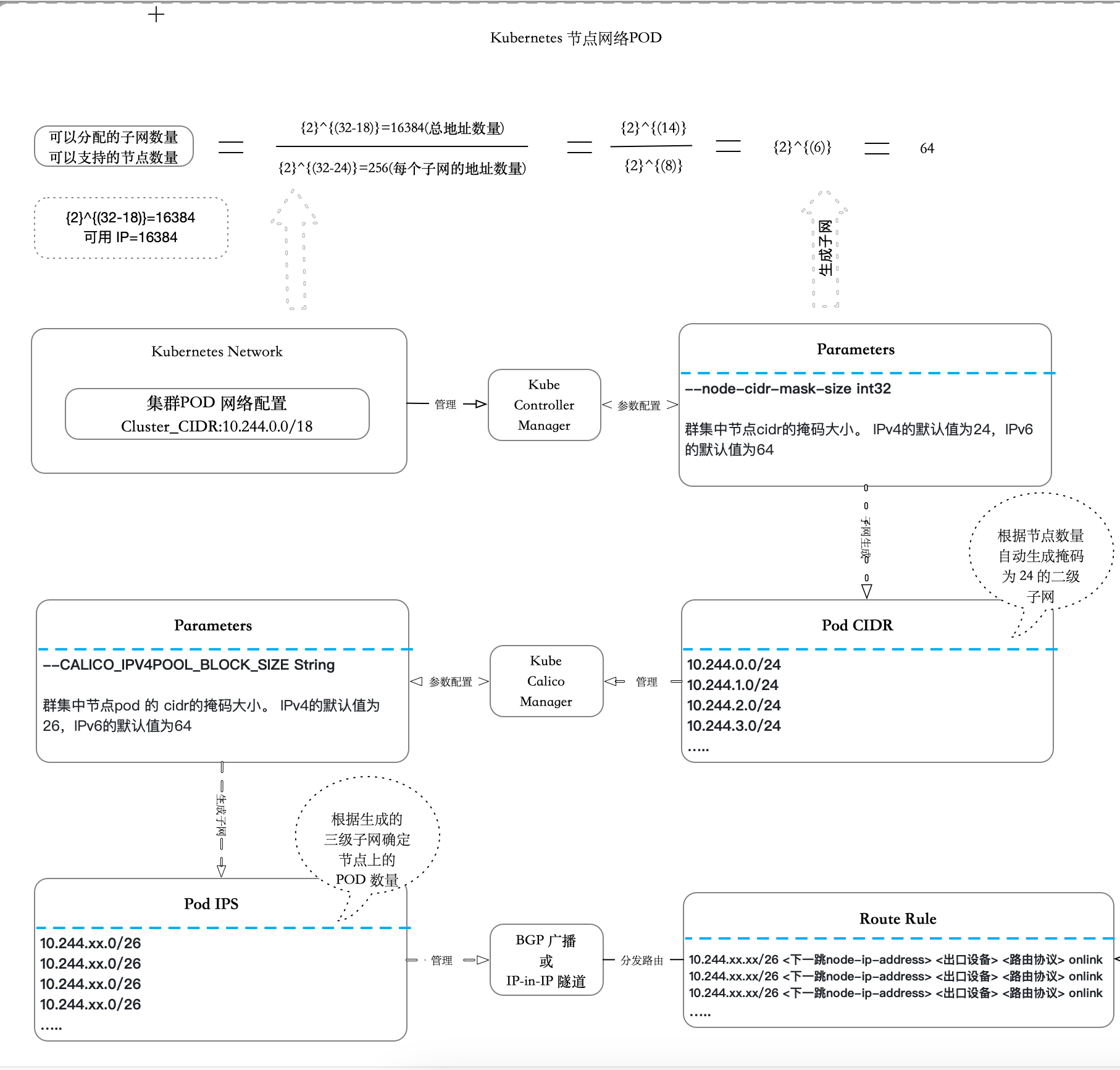 如图展示,在每个 Node 节点分配了 10.244.(0-63).0/24的池子,又通过 Kube-Calico-Manager 生成了 POD IPS 的更小池子,当 POD 启动并且分配了 IP 时会在 Node 节点生成路由规则(通过BGP 广播