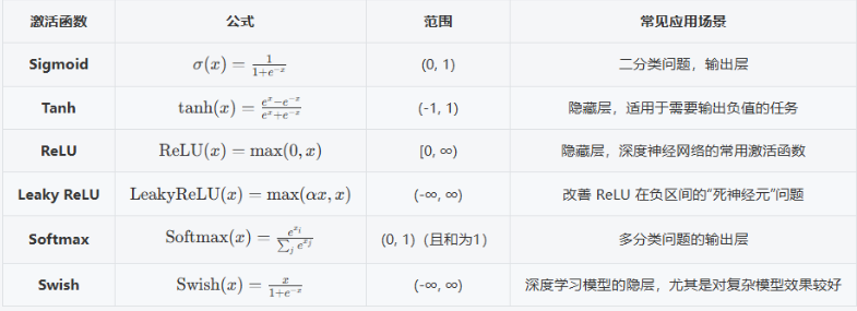 ReLU 和 Leaky ReLU 常用于隐藏层,尤其是深度神经网络中,后者通过为负数部分引入斜率,避免了 ReLU 的"死神经元"问题。
