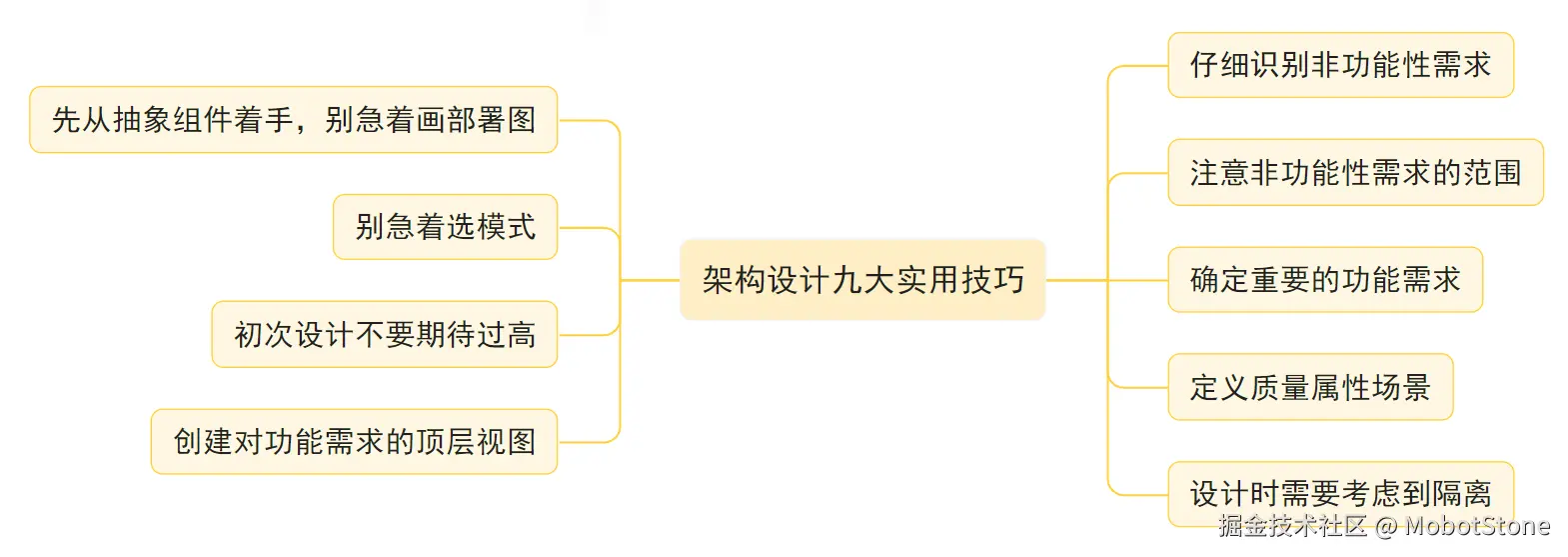 我想与你分享一些在设计软件架构时非常有用的技巧和最佳实践(如图9-1所示)。这些建议可能比如ATAM这样的现有方法来得更加灵活和实用,它们不那么依赖于严格的规则,而是更加注重于实际效果和快速迭代。这些建议是基于我个人在参与多个大型咨询和工程项目中积累的经验,虽然它们带有一定的个人主观色彩,但它们都是经过实践检验的有效方法。