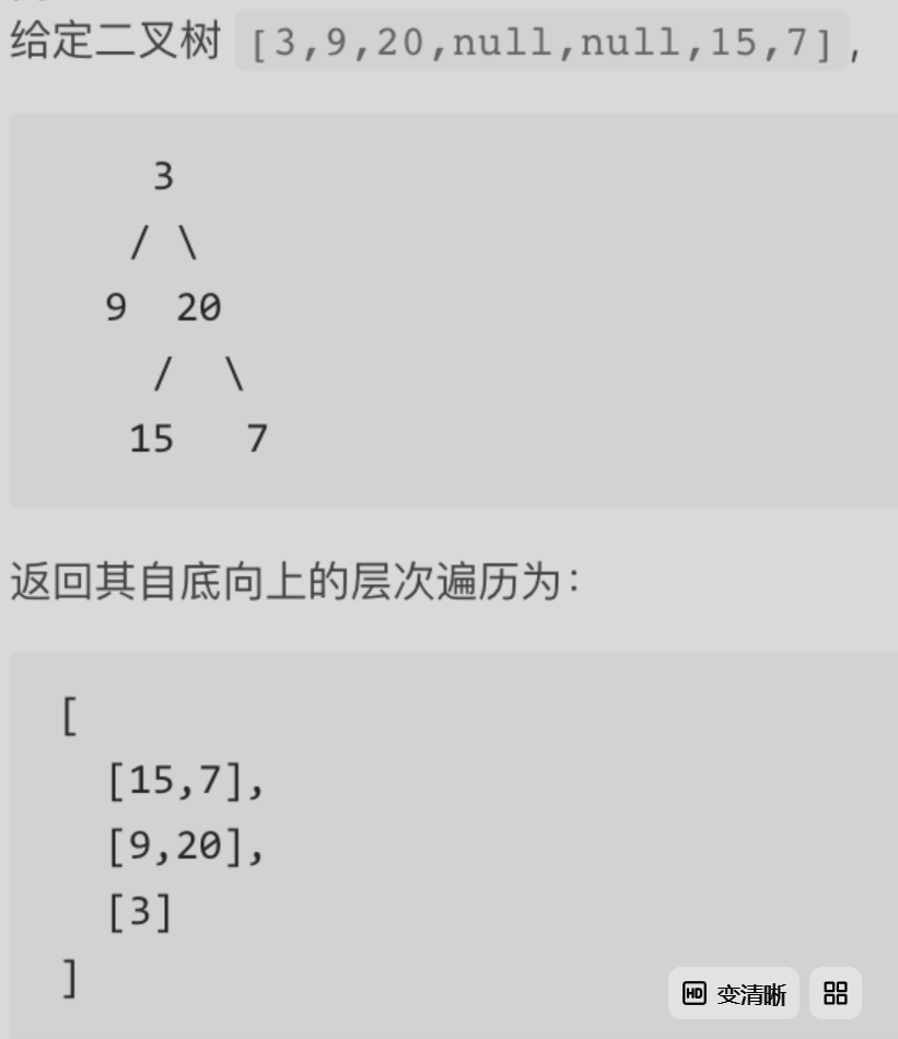 给定一个二叉树,返回其节点值自底向上的层次遍历。 (即按从叶子节点所在层到根节点所在的层,逐层从左向右遍历)