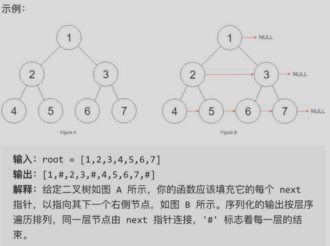 填充他的每个next指针,让这个指针指向其下一个右侧节点。如果找不到下一个右侧节点,则将next指针设置为null。