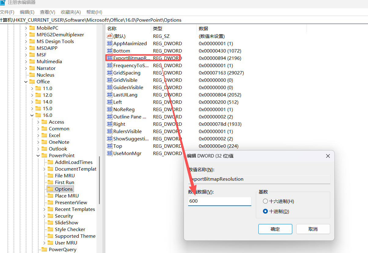 3.如下图,打开option,右键 新建 → DWORD(32位)值(D) → 重命名(改为"ExportBitmapResolution") → 选中ExportBitmapResolution右键修改 → 设置为10进制,输入导出的dpi。我这里输入了600dpi,一般300dpi也够了(dpi越大,图片越清晰,图片文件大小越大)