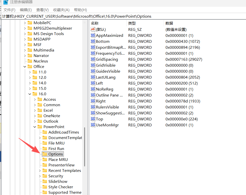 2.打开注册表编辑器后按照下面顺序找到ppt的配置文件