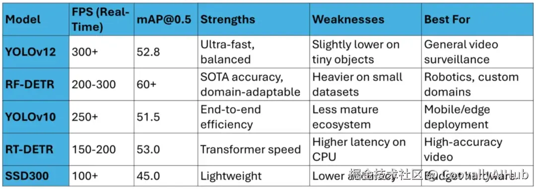 目前实时检测领域已经炸开了锅,YOLO 系列依然是王者,YOLOv12 优化了主干网络,在速度与精度间找到新平衡;而 RF-DETR 在复杂场景下表现亮眼,mAP 可达 60,速度也不慢。