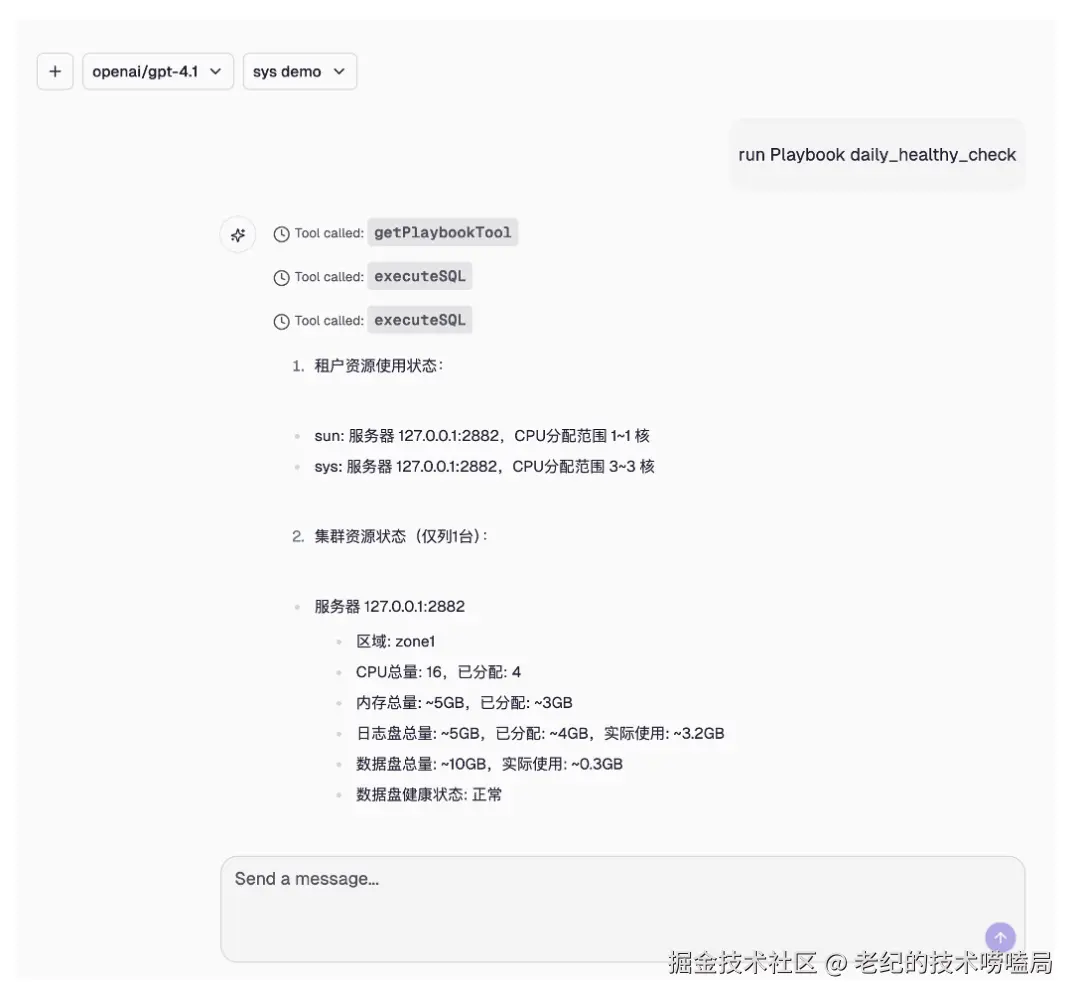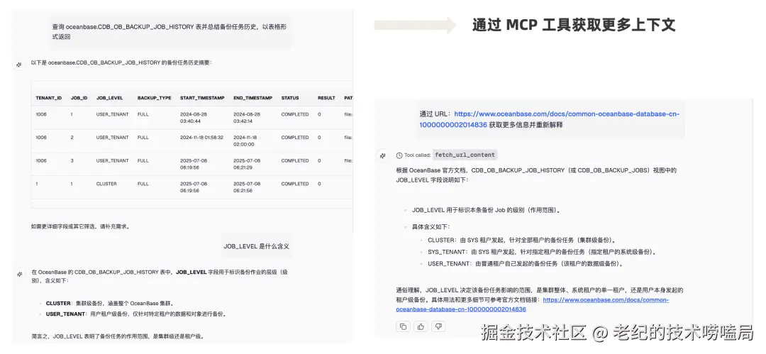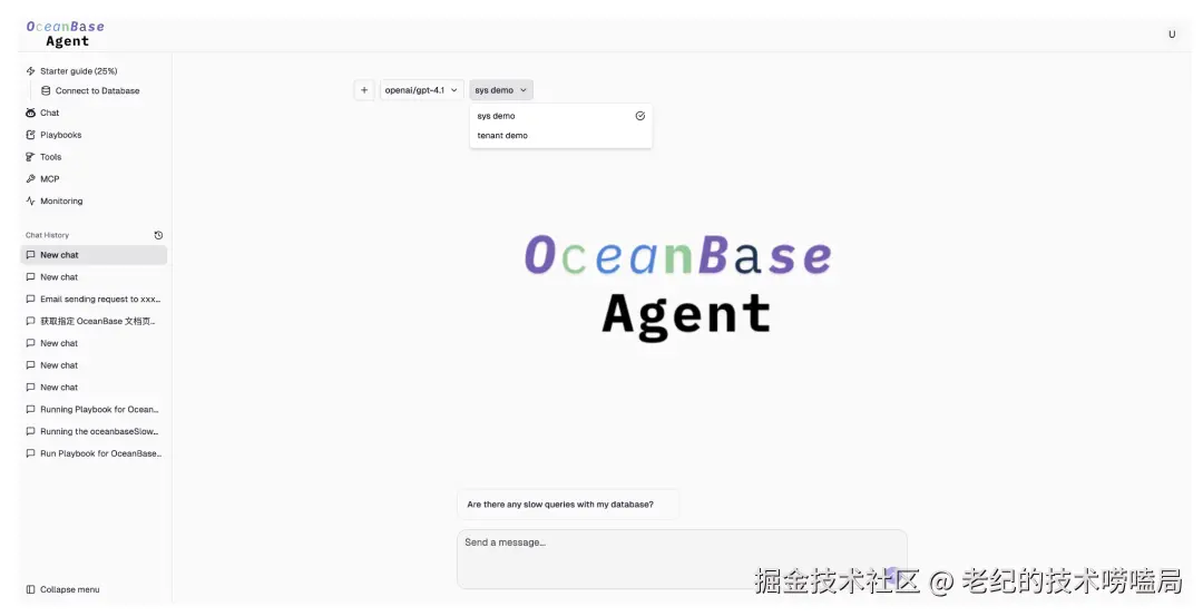 用户仅需用自然语言描述任务,系统会自动化执行。例如"查询 OceanBase 的慢查询,并分析原因"。可明确每个工具的名称,以提高成功率。
