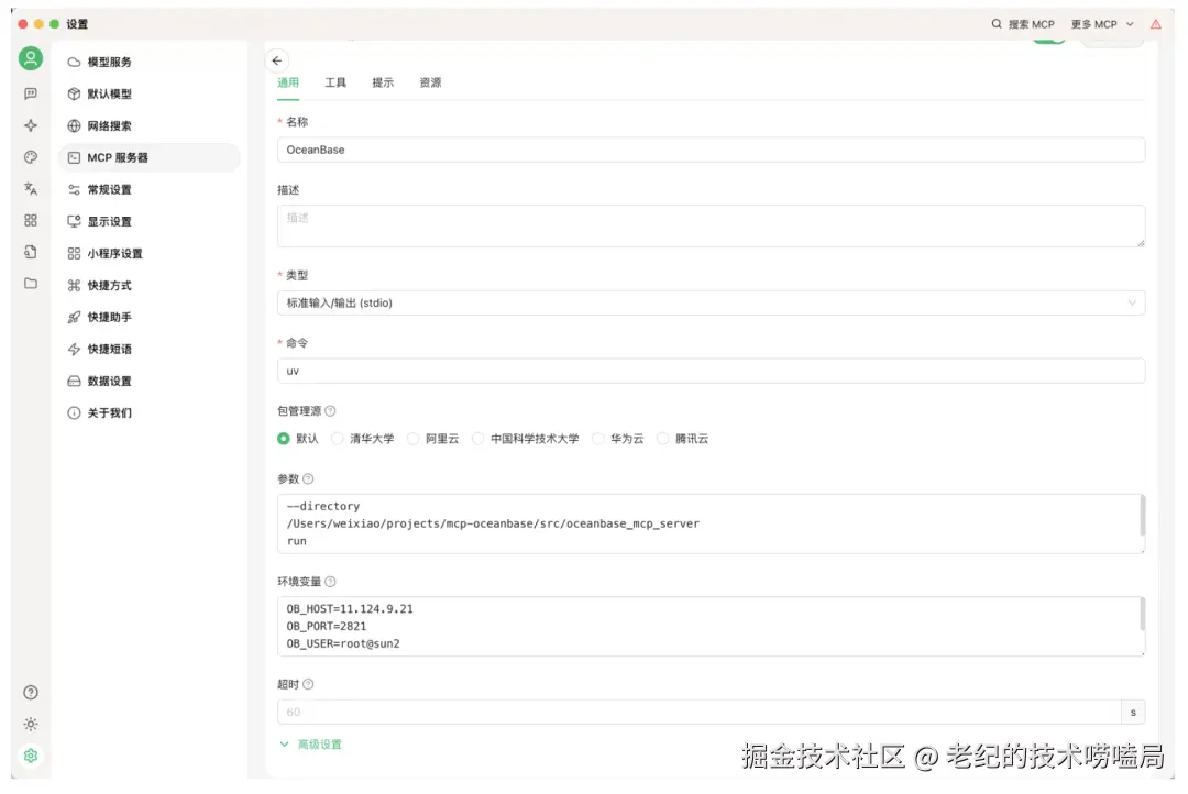 每新增一个数据库就必须启动一个独立的 MCP Server,重复填写环境变量,工具列表随之膨胀,令大模型难以区分。以 Cherry Studio 为例,需要在该工具的 MCP 配置界面手动填写数据库连接的环境变量,才能检测到 MCP Server 提供的工具,例如执行 SQL 工具 execute_sql、获取 ash_report 工具 get_ob_ash_report 等,可以调用这些工具直接在数据库中执行。但如果有多个数据库时,例如需要加两个数据库,MCP Server 是不支持的,只能通过加两个 MCP Server 实现,需要填两个数据库地址,此时工具也会有两份,对于大模型面对两份一模一样的工具列表可能就很困惑。