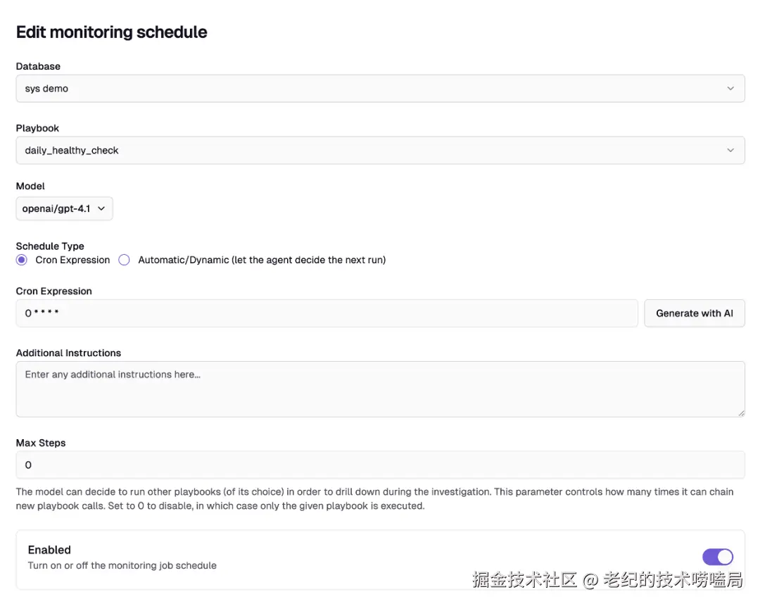 日常巡检可以配合 Scheduler 运行,并使用 AI 生成 Cron Expression 表达式,生成 Scheduler 后即可实现定期执行 Playbooks。