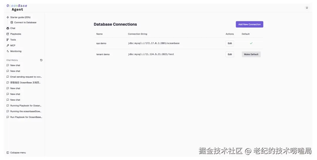 上述问题的根本原因是通用 MCP Client 不是专门为数据库设计的,在使用方式上存在兼容问题,我们以低成本构建了 OceanBase Agent(社区非官方项目),目标是通过自然语言交互即可管理任意数量的 OceanBase 实例,显著减轻 DBA 工作负担。