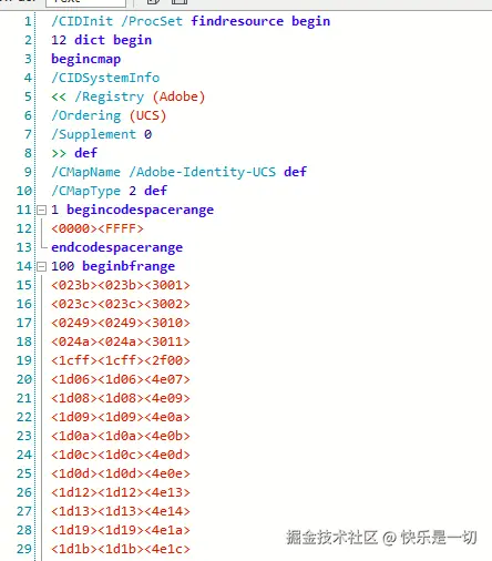 指向的对象,一般是个流式对象,解压后可以看到他的明文大概是如下图样式,从beginbfrange开始的每一行含义是:<源编码><对应Unicode><实际字符>,意思是上面内容中的023b