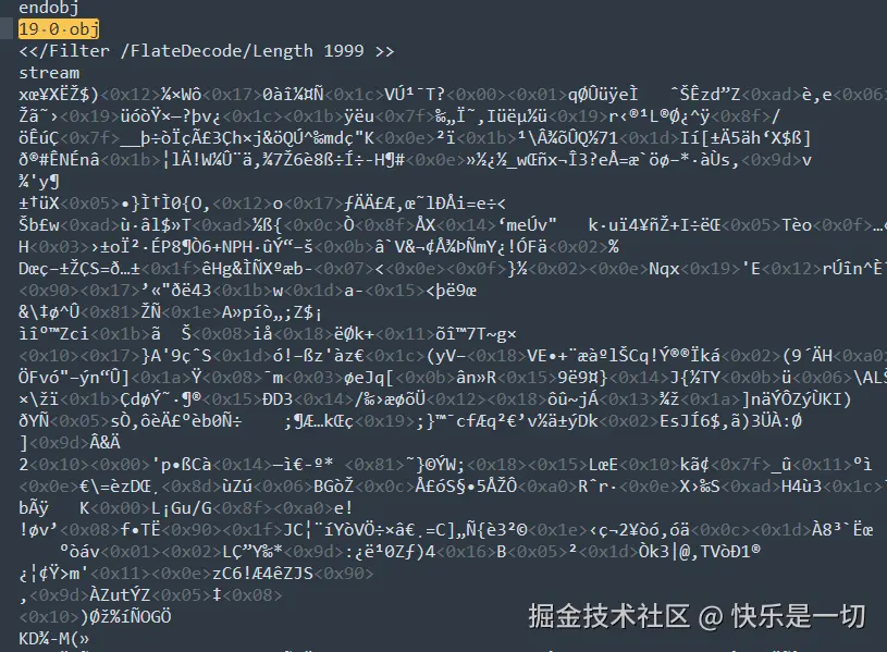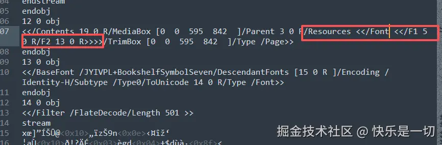 可以看到在实际的pdf中,内容部分是数据和字符串加密后的编码,你找到字体对象