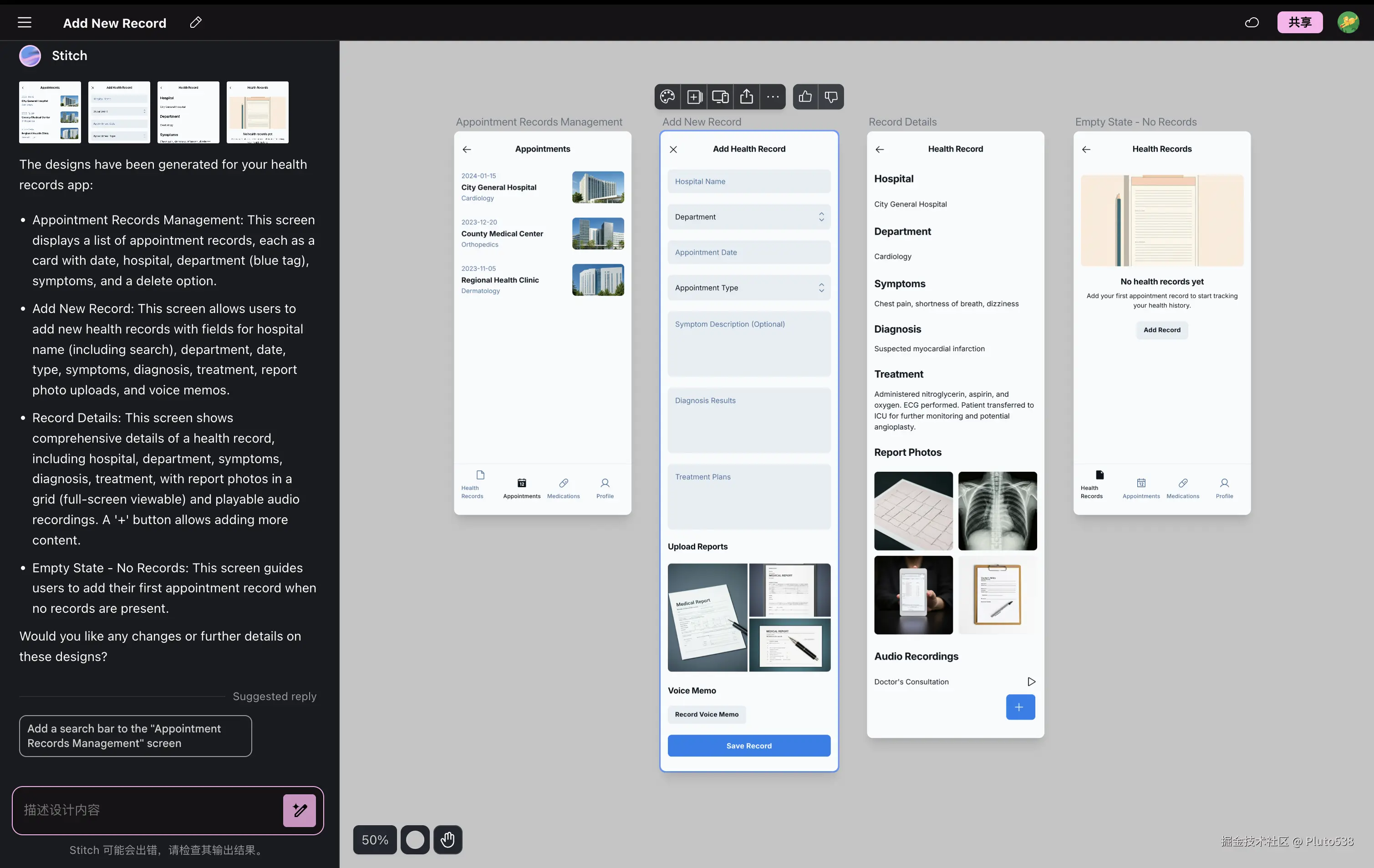 我决定重新设计UI。第一站,我找到了国产的Mastergo。我将XunDoc的核心界面截图喂给它,并提示:"请为这款家庭健康管理应用生成几套更现代、更友好的UI设计方案。"