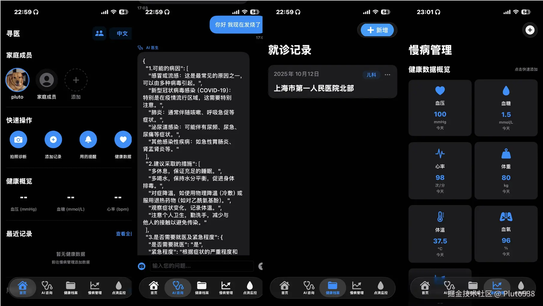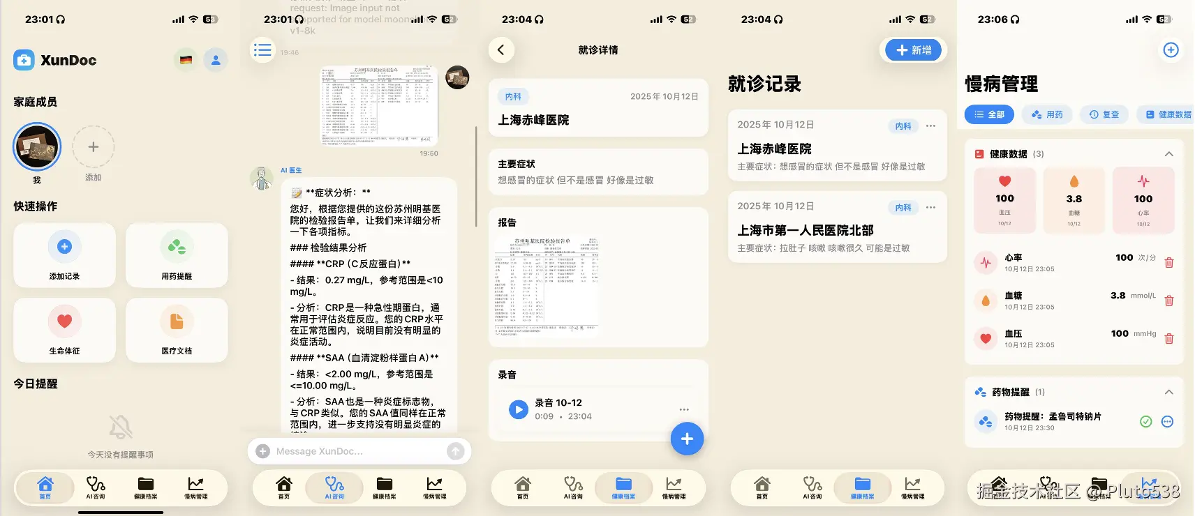 当我在生活中目睹家人为管理复杂的健康数据、用药提醒而手忙脚乱时,一个想法冒了出来:我能否打造一个App,像一位贴心的家庭健康管家,把全家人的健康都管起来?它不仅要能记录数据,还要够聪明,能解答健康疑惑,能主动提醒。这就是 XunDoc App。