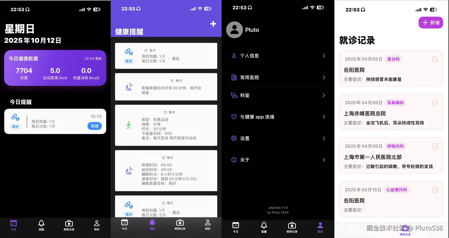 拿着Claude的输出,我结合Mastergo和Stitch的视觉灵感,再让Cluade一步一步的微调。我意识到,颜色不仅是美观,更是传达情绪和功能的重要工具。我将原本统一的蓝色系,根据功能模块进行了区分:健康数据用沉稳的蓝色,AI咨询用代表智慧的紫色,医疗提醒用醒目的橙色。图标也设计得更加线性轻量,减少了视觉负担。(其实这是Deepseek给我的建议)这就是最终的第三套迭代方案 :在清晰的结构上,注入温暖与亲和力。