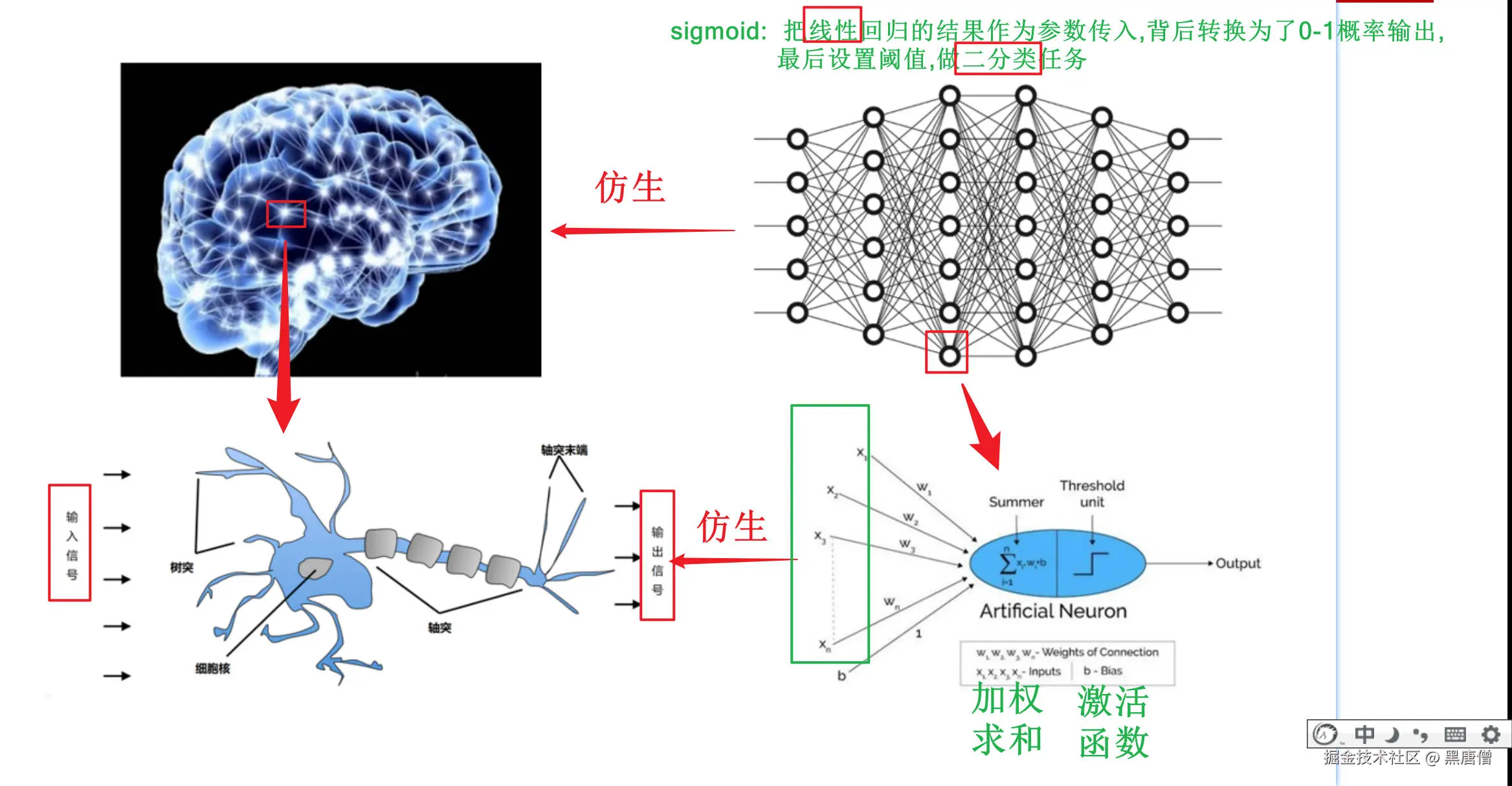 深度学习呢, 实际是模仿了大脑神经元的生物结构。 这种模仿神经元, 从输入信号,到树突处理信号, 到通过细胞核去做反应, 最后将信号进行输出的过程。 以及神经元的相互连接, 像是图2一样, 通过左往右, 每一个圆圈类似一个神经元类似一个逻辑回归的模型, x相当于特征, w相当于权重, b相当于偏置。 通过加权求和, 激活函数, 让每一个神经元都分类, 从而做非线性预测