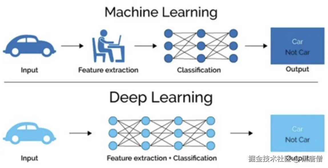机器学习, 需要我们通过收集到的数据集, 进行特征提取, 这里的特征提取, 特别依赖专家, 因为一些特征只有当前细分领域的专家才知道哪些特征的权重以及特种中相关指标和阈值, 而深度学习方法不需要人工, 而是依赖算法自动提取特征。 深度学习模仿人类的大脑的运行方式, 从经验中学习获取知识, 这也是深度学习被看做黑盒子, 可解释性差的原因,
